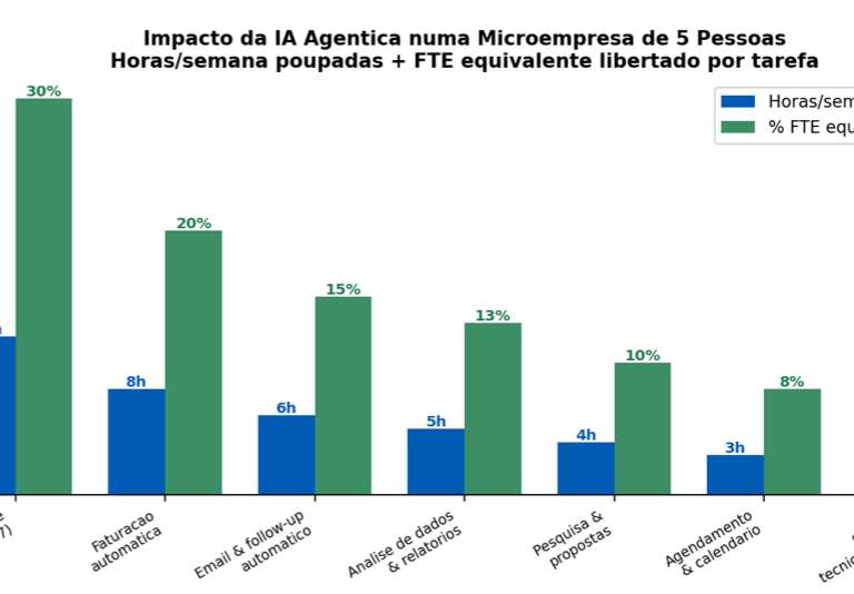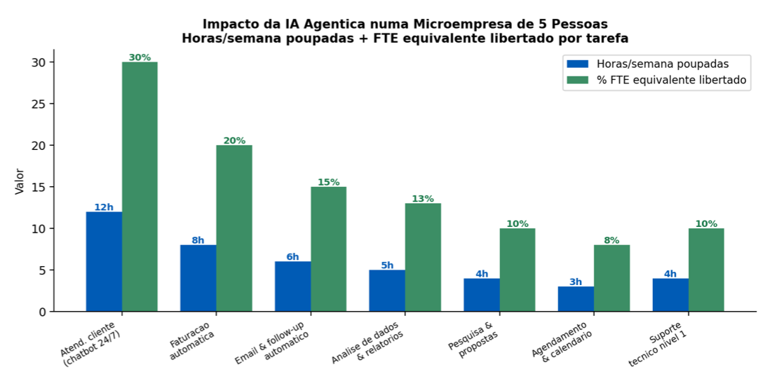 Impacto da IA Agêntica numa microempresa de 5 pessoas: horas/semana poupadas por tarefa e equivalente FTE libertado. Total estimado: 42h → 10h/semana = +32h produtivas. Fontes: McKinsey / Goldman Sachs 2024 / Atlassian 2025 / elaboração ENIA
